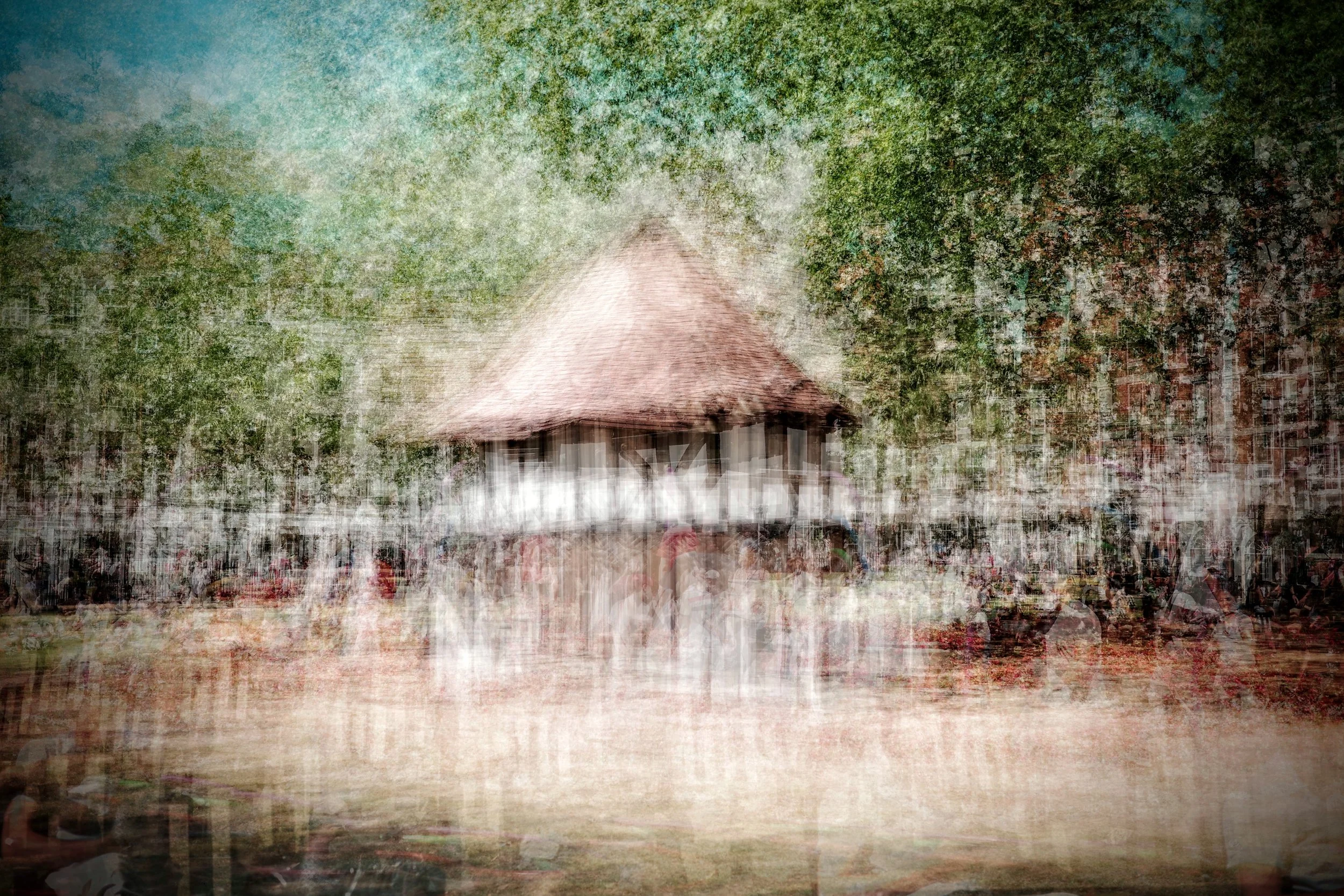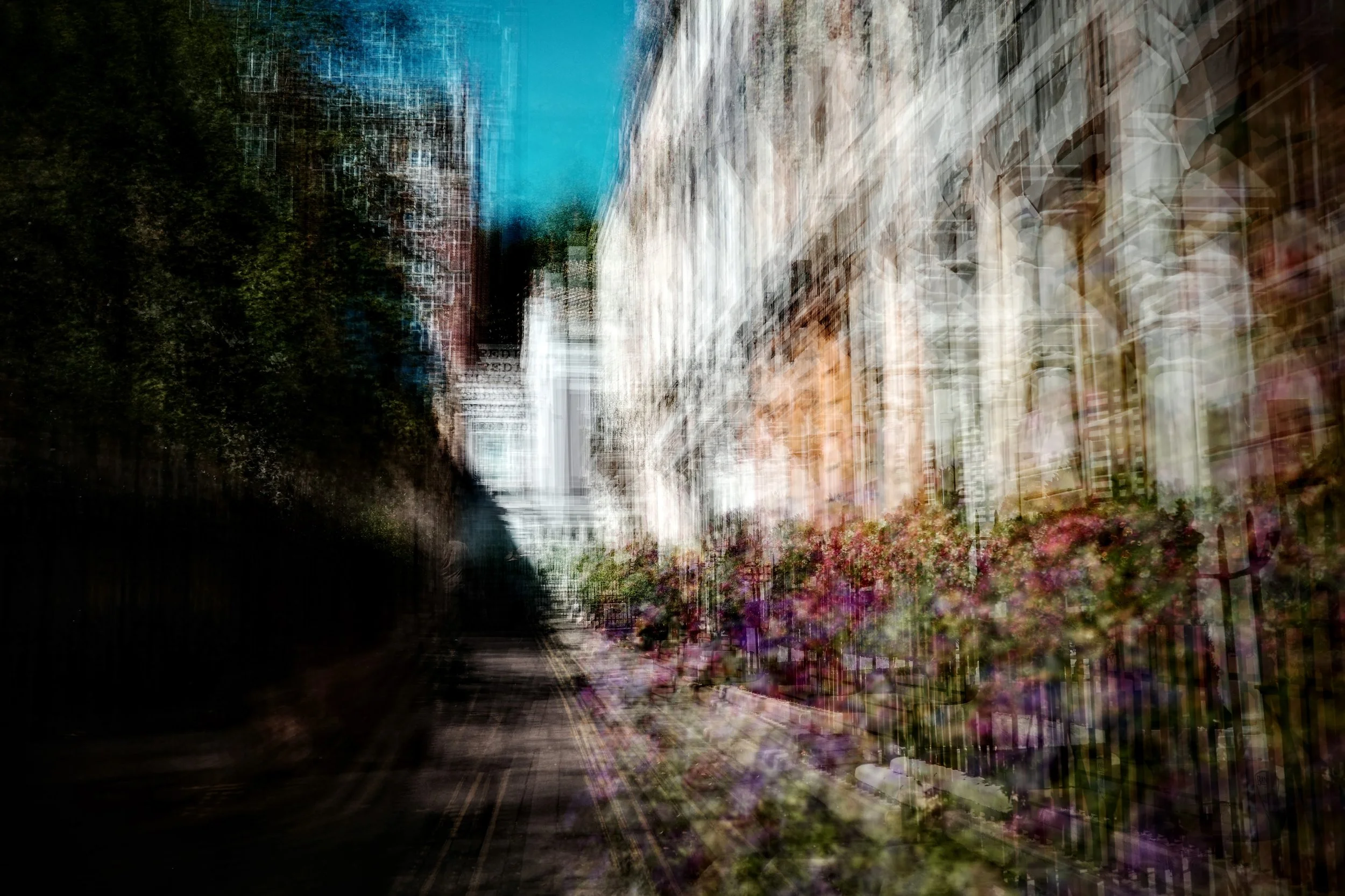 I picked a window of the house at the end of the street as my focus point. As more and more images get layered onto each other, and in the brightness of the sunlight on the camera’s display, it becomes quite hard to get roughly the same composition every time. To make things easier, I used the focus point as a “marker”. At the start of a layering sequence, I would set up my initial composition and then move the focus point on top of the subject I had chosen, the house window in this case. I’d then leave the focus point in that position for every subsequent shot in the sequence. For every following shot I would move a bit, compose so the focus point was over the house window, take the shot, and repeat. This ensured that I’d get the effect I wanted of a mostly-recognisable scene, and I wouldn’t lose my “place” and have too much separation from one frame to another.