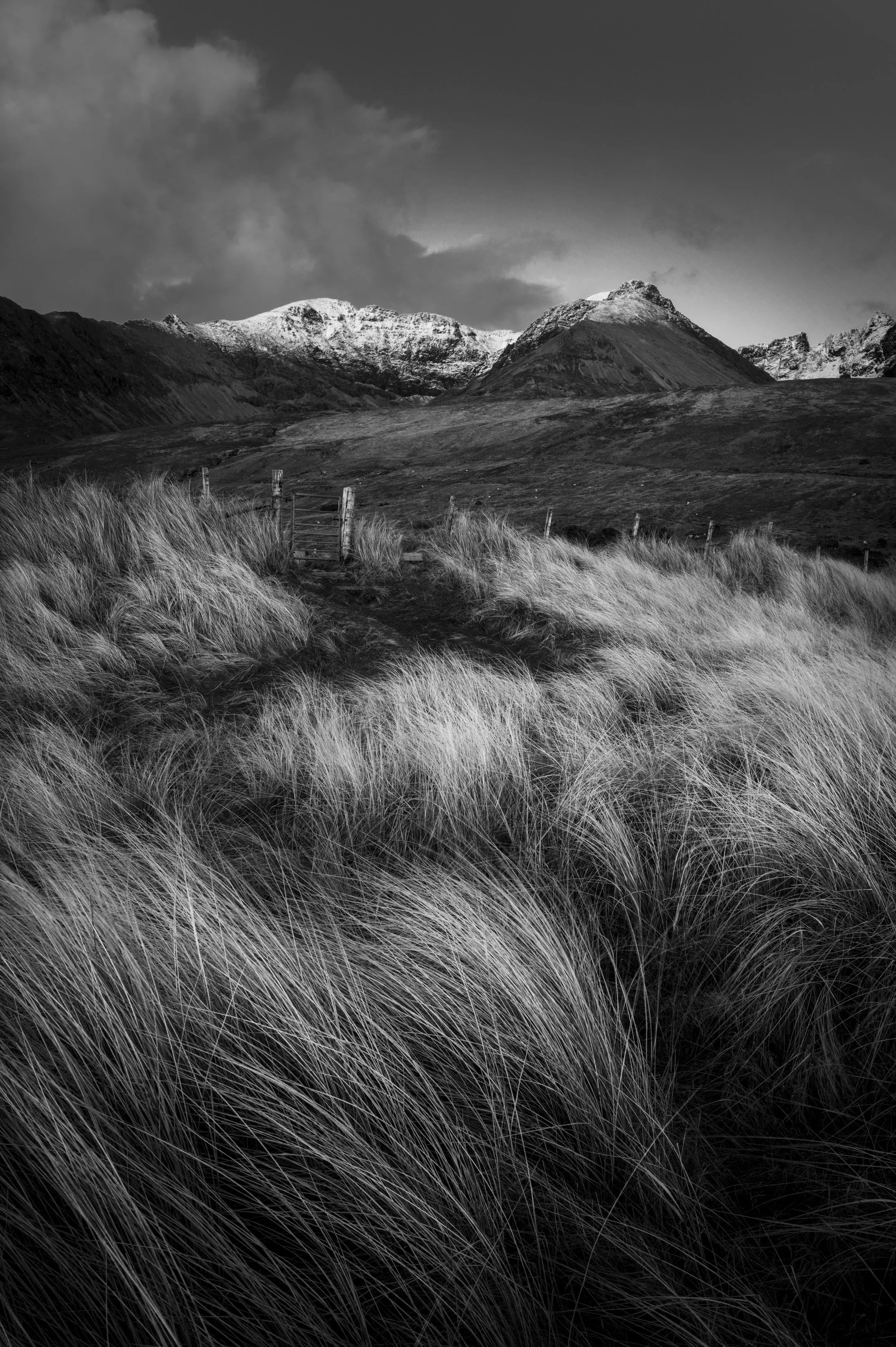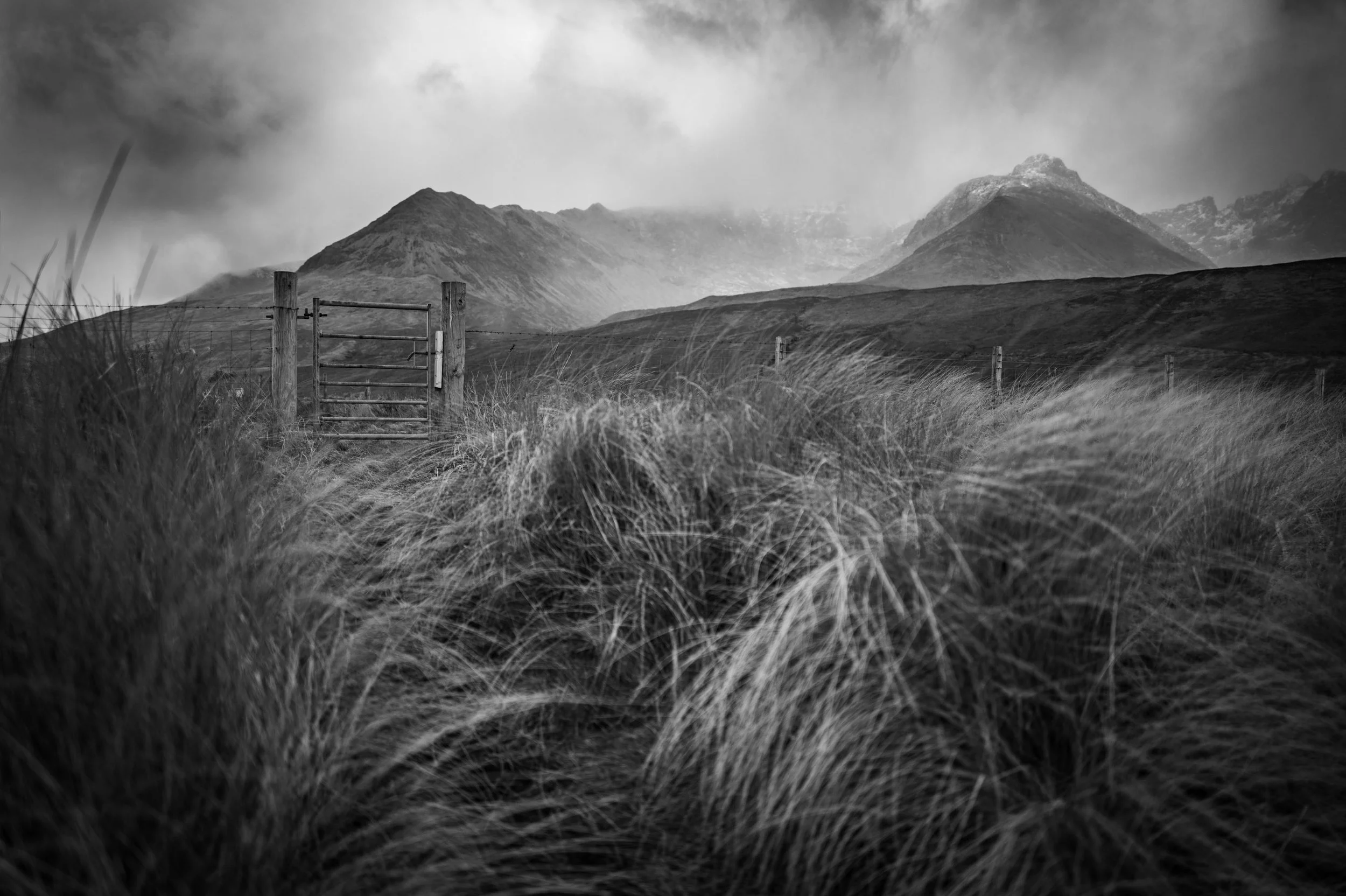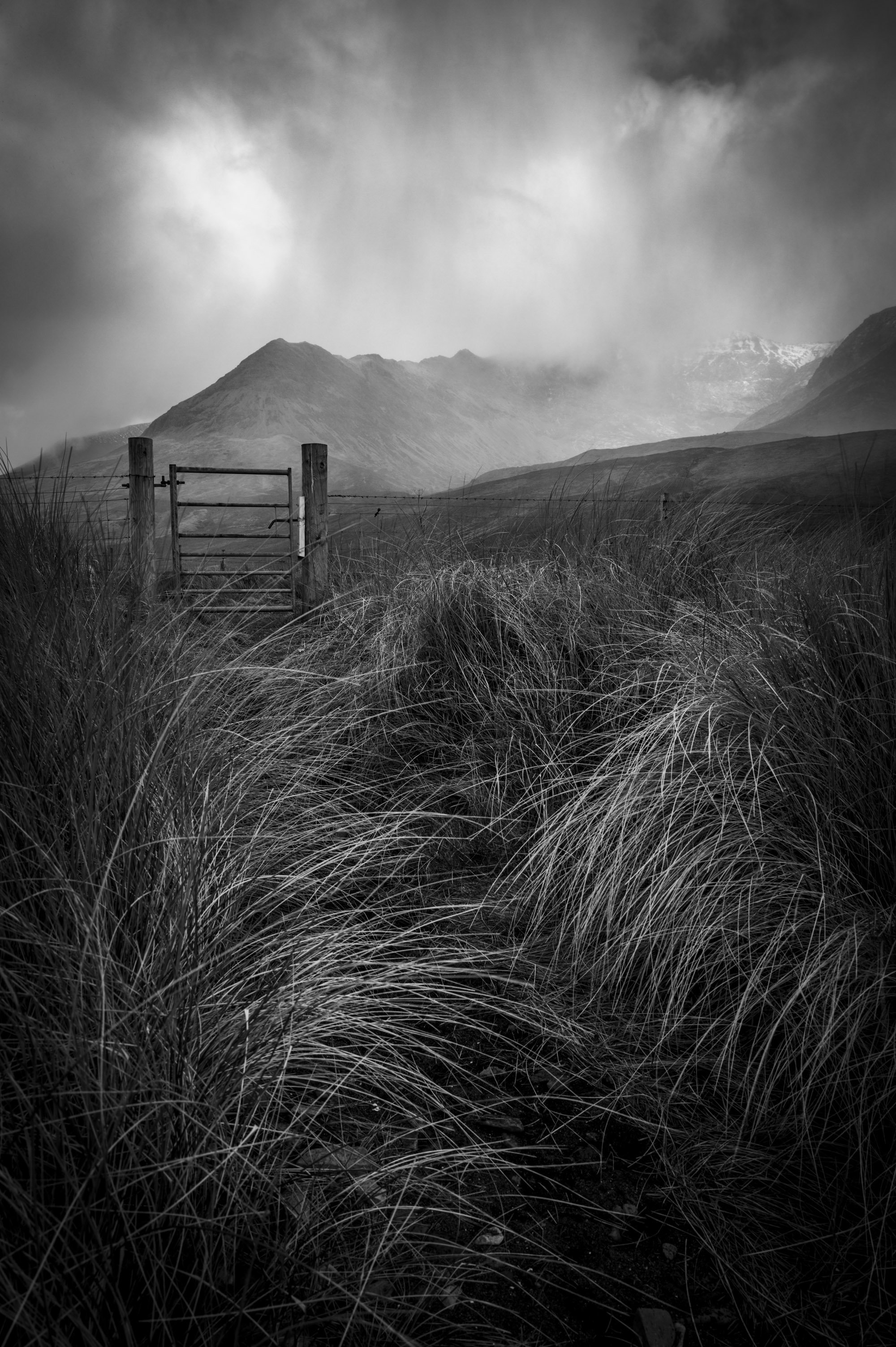 The snow shower blasted down the glen at speed. The small bits of my face that were exposed to the elements felt red and raw from the hail and fine snow that had scoured them. The sky over the mountains changed second-by-second, giving me the much-needed drama that my original photograph from two years ago had been lacking. The different position, keeping the gate closer to the camera, works a lot better as well. It was, as usual, all well worthwhile.